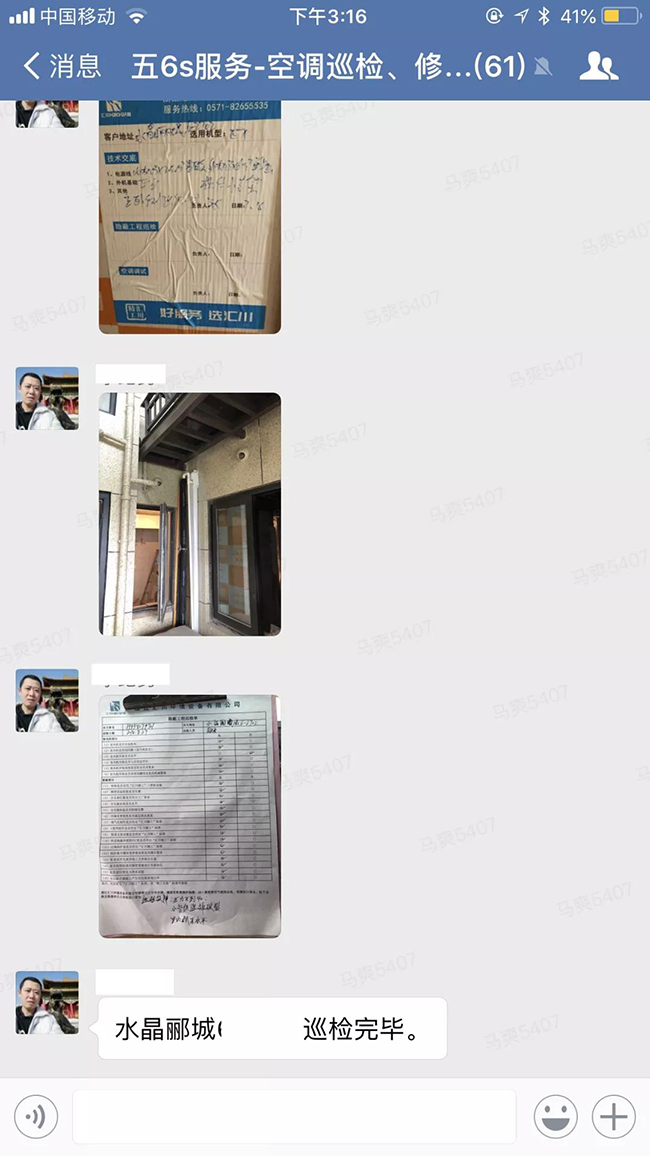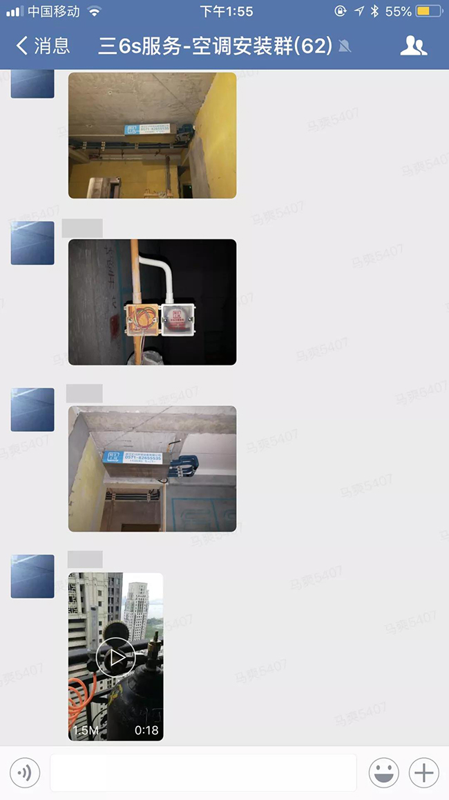 安裝師傅把當天安裝工地的安裝步驟和最后成品用照片、視頻記錄下來。包括每一臺內(nèi)機、線控器;每一步安裝節(jié)點:充氮焊接、養(yǎng)水、保壓、外機保護套等,連同房號發(fā)至安裝群和業(yè)主,供公司和業(yè)主們監(jiān)督和留底。