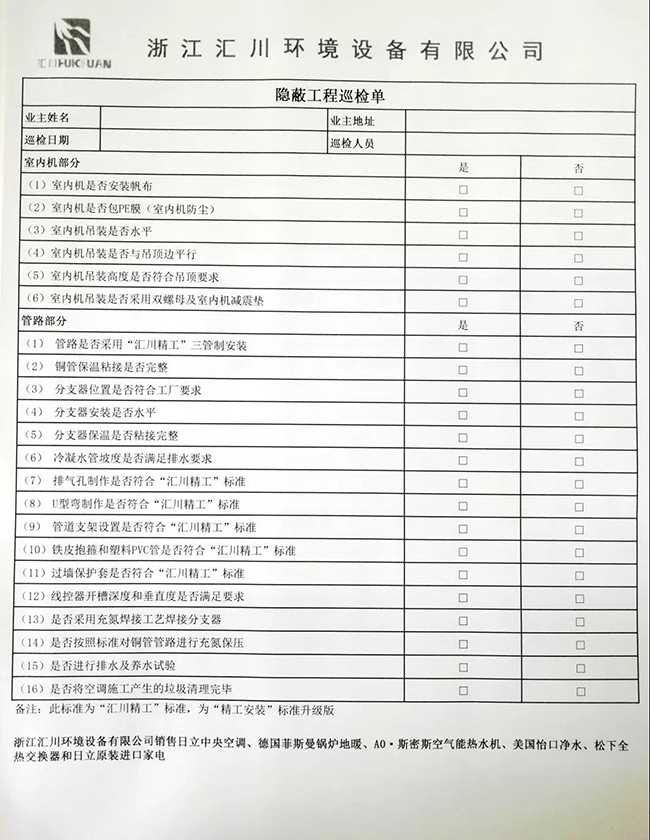 工作要點:室內(nèi)、外機定位及安裝情況檢查;保壓情況檢查;養(yǎng)水情況調(diào)查;管理安裝規(guī)范性檢查;外機散熱條件及措施檢查