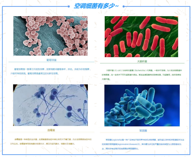 長此以往,空氣中的粉塵、污垢和細(xì)菌就會(huì)在空調(diào)內(nèi)部積聚,附著在室內(nèi)機(jī)的細(xì)菌(葡萄球菌,大腸桿菌、曲霉菌、軍團(tuán)菌等)隨送風(fēng)系統(tǒng)吹回室內(nèi),污染室內(nèi)的空氣、傳播疾病,嚴(yán)重影響人們身心健康。